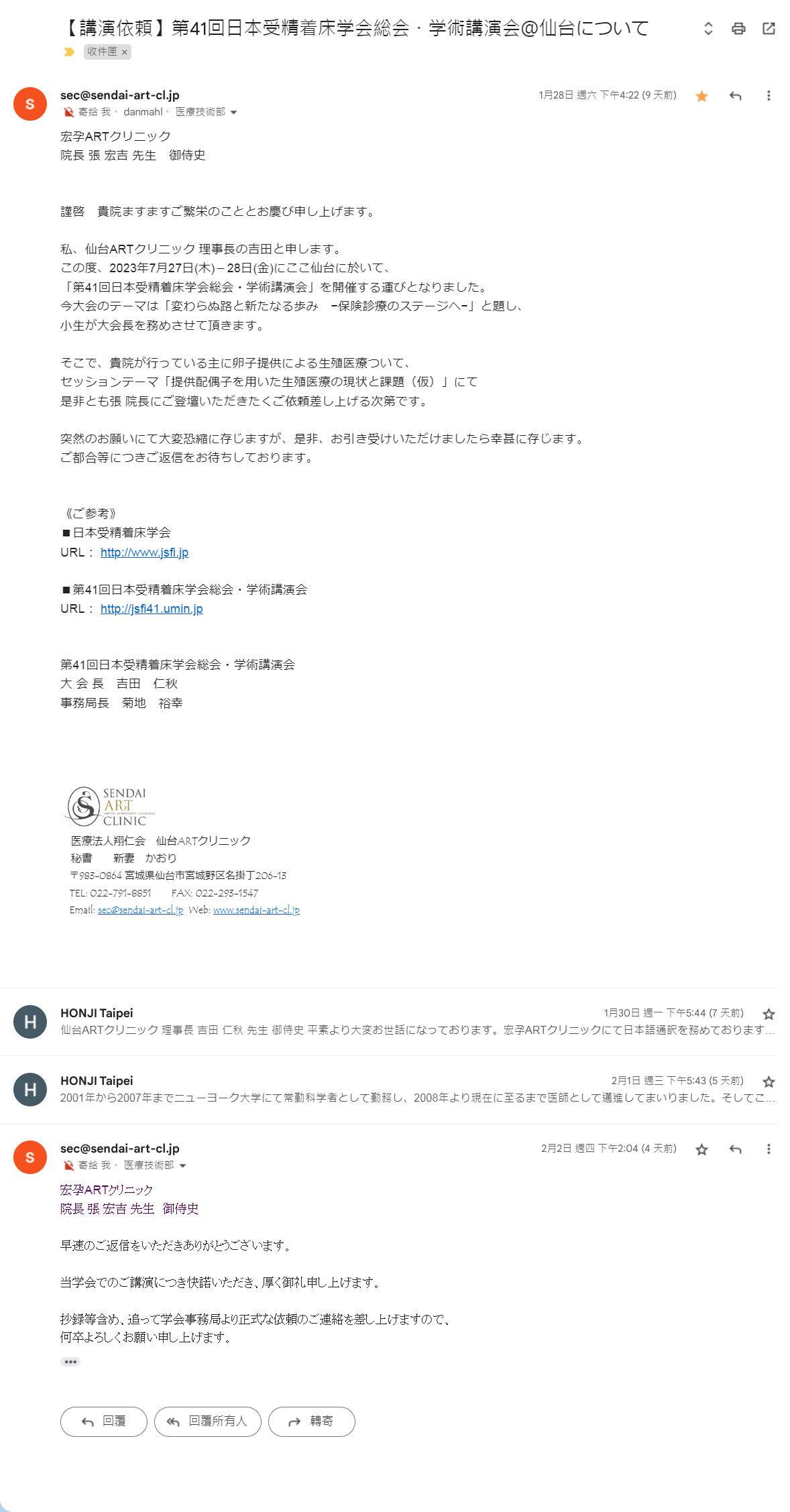 FireShot Capture 003 – 【講演依頼】第41回日本受精着床学会総会・学術講演会@仙台について – ss091436@gmail.com – Gmail_ – mail.google.com Published 2023-02-06 at 1178 × 2255 in Dr. Hung Chi Chang was invited to have speech at the Japan Reproductive Medicine Congress in July 2023. It is an honor for us! ← Previous Next →