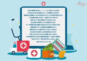 先日の地震に関しまして、ニュースでご覧になった方をはじめ沢山の方からお気遣いのメールを頂戴しております。